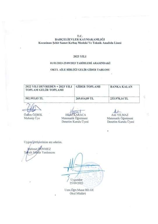 Okul Aile Birliği Gelir Gider Tablolarımız aşağıdadır.